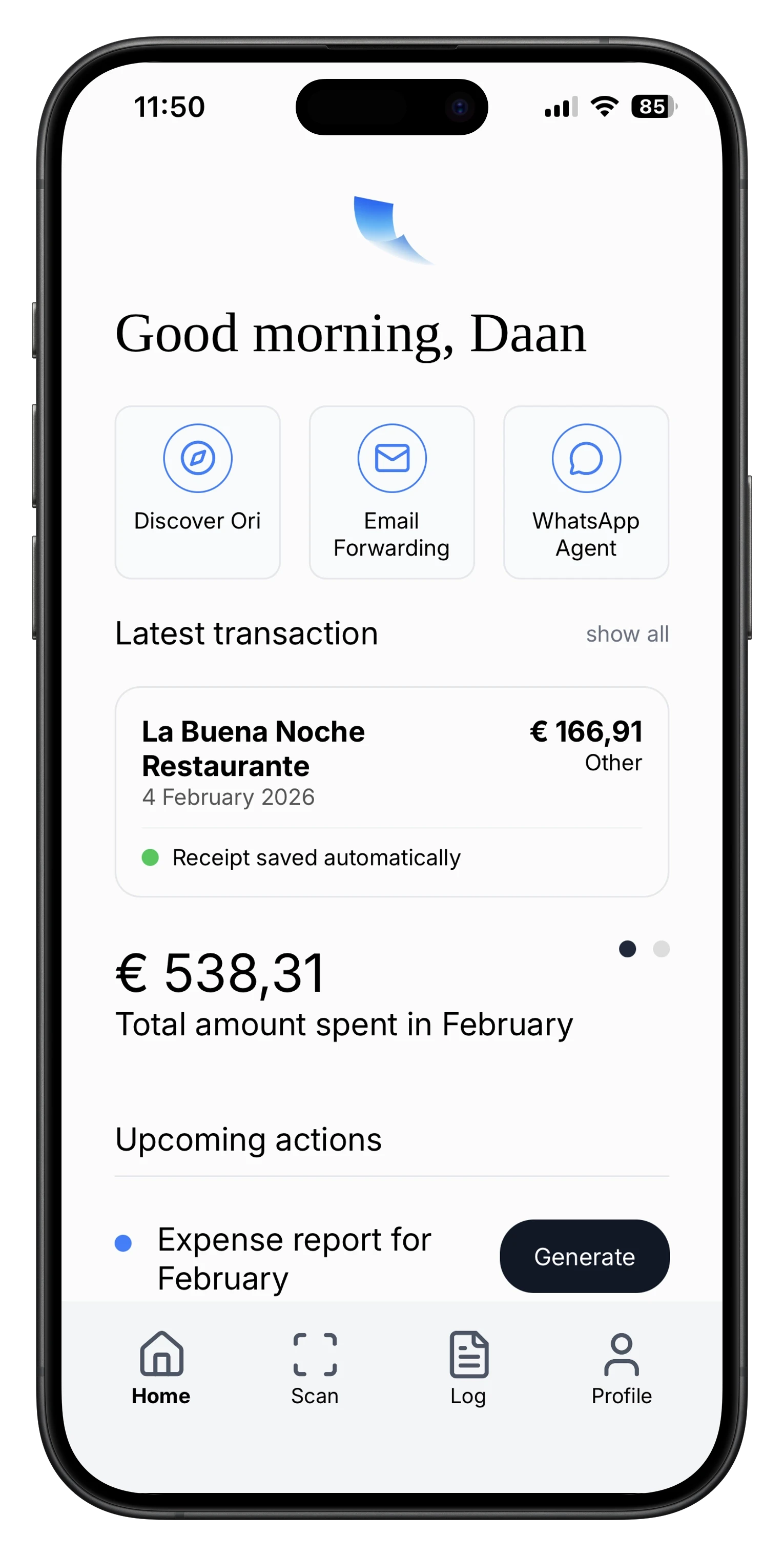 Ori is the infrastructure layer connecting POS systems, bank feeds, and your ERP system. We automate receipt collection to eliminate manual reporting and ensure full VAT compliance for SMEs. We don't just track spend; we reconcile it instantly.